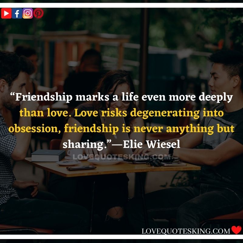 “Friendship marks a life even more deeply than love. Love risks degenerating into obsession, friendship is never anything but sharing.”―Elie Wiesel