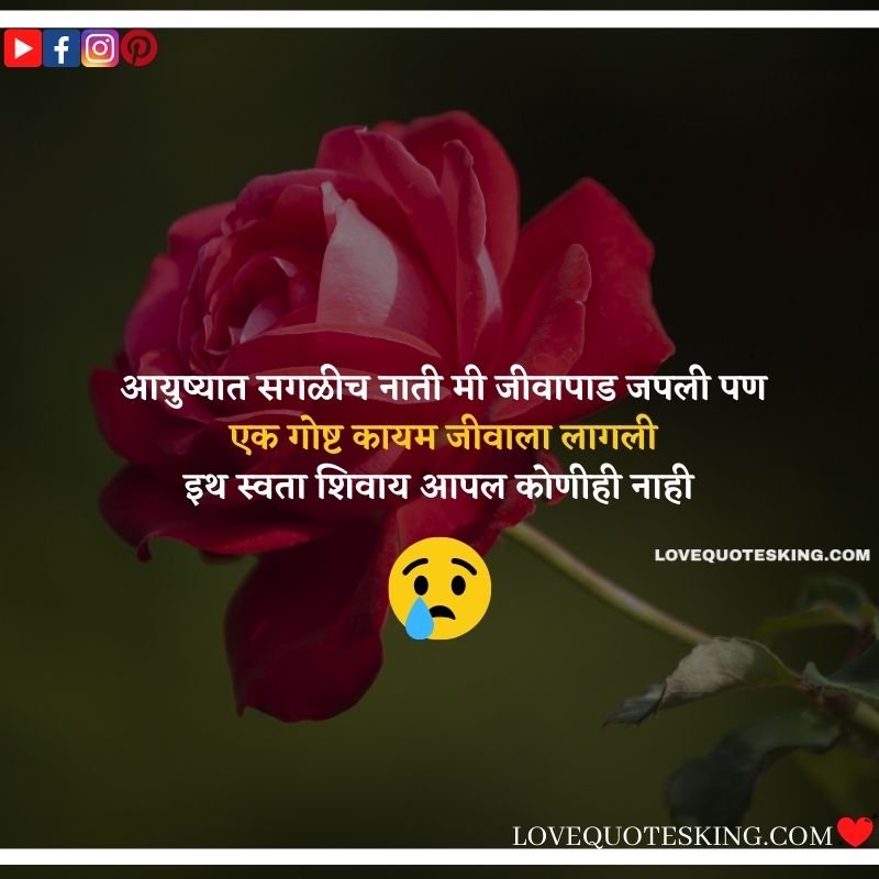 आयुष्यात सगळीच नाती मी जीवापाड जपली पण एक गोष्ट कायम जीवाला लागली इथ स्वता शिवाय आपल कोणीही नाही