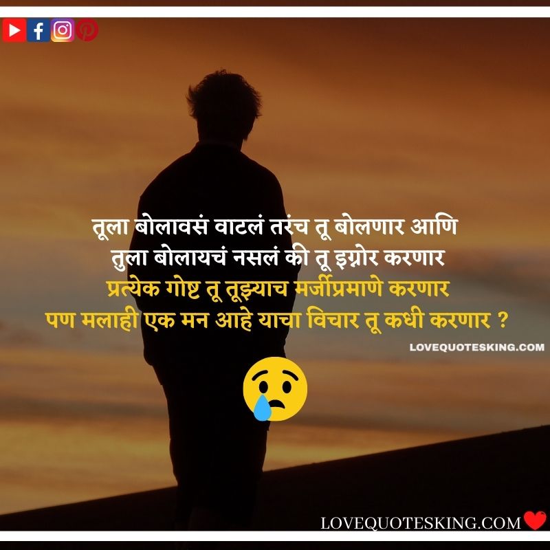 तूला बोलावसं वाटलं तरंच तू बोलणार आणि तुला बोलायचं नसलं की तू इग्नोर करणार प्रत्येक गोष्ट तू तूझ्याच मर्जीप्रमाणे करणार पण मलाही एक मन आहे याचा विचार तू कधी करणार ?