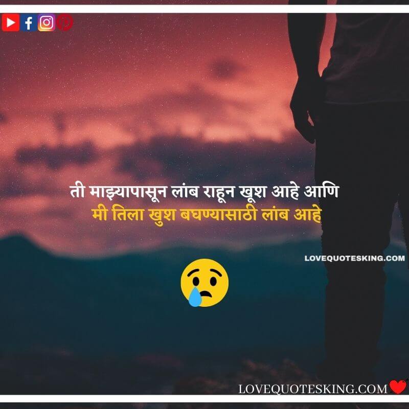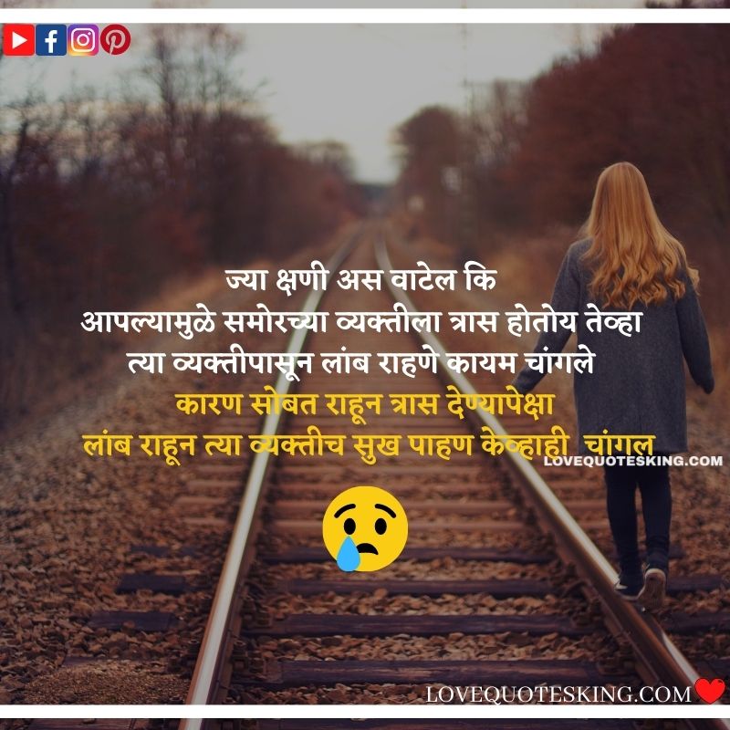 ज्या क्षणी अस वाटेल कि आपल्यामुळे समोरच्या व्यक्तीला त्रास होतोय तेव्हा त्या व्यक्तीपासून लांब राहणे कायम चांगले कारण सोबत राहून त्रास देण्यापेक्षा लांब राहून त्या व्यक्तीच सुख पाहण केव्हाही चांगल