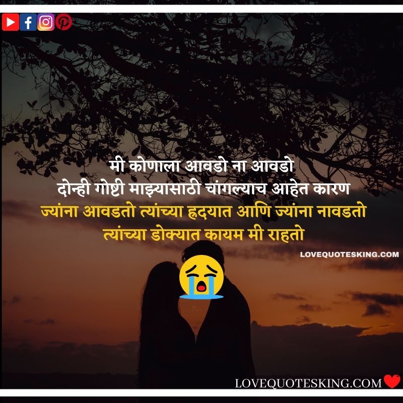 मी कोणाला आवडो ना आवडो दोन्ही गोष्टी माझ्यासाठी चांगल्याच आहेत कारण ज्यांना आवडतो त्यांच्या ह्रदयात आणि ज्यांना नावडतो त्यांच्या डोक्यात कायम मी राहतो