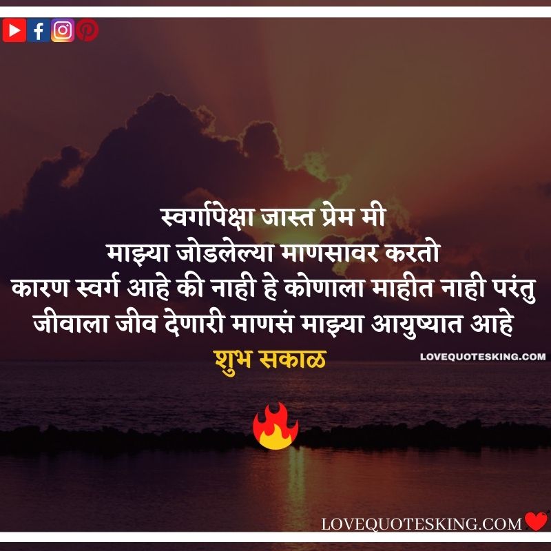 рд╕реНрд╡рд░реНрдЧрд╛рдкреЗрдХреНрд╖рд╛ рдЬрд╛рд╕реНрдд рдкреНрд░реЗрдо рдореА рдорд╛рдЭреНрдпрд╛ рдЬреЛрдбрд▓реЗрд▓реНрдпрд╛ рдорд╛рдгрд╕рд╛рд╡рд░ рдХрд░рддреЛ рдХрд╛рд░рдг рд╕реНрд╡рд░реНрдЧ рдЖрд╣реЗ рдХреА рдирд╛рд╣реА рд╣реЗ рдХреЛрдгрд╛рд▓рд╛ рдорд╛рд╣реАрдд рдирд╛рд╣реА рдкрд░рдВрддреБ рдЬреАрд╡рд╛рд▓рд╛ рдЬреАрд╡ рджреЗрдгрд╛рд░реА рдорд╛рдгрд╕рдВ рдорд╛рдЭреНрдпрд╛ рдЖрдпреБрд╖реНрдпрд╛рдд рдЖрд╣реЗ.рд╢реБрдн рд╕рдХрд╛рд│