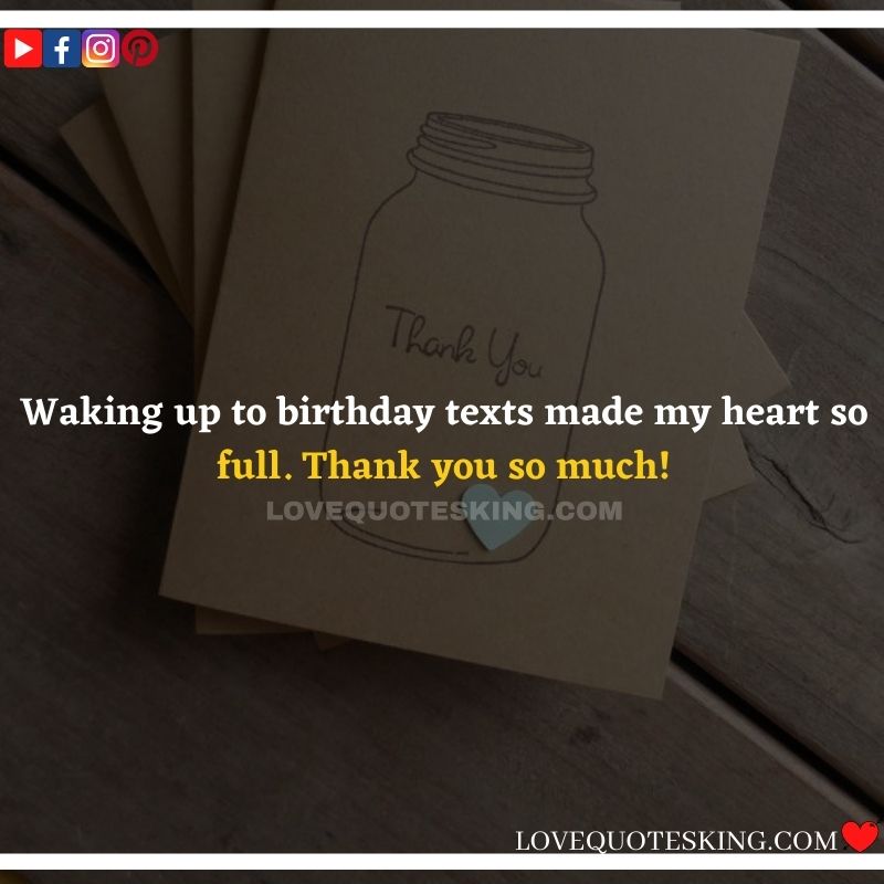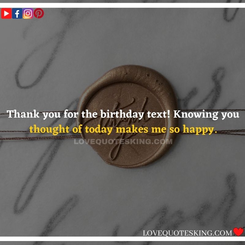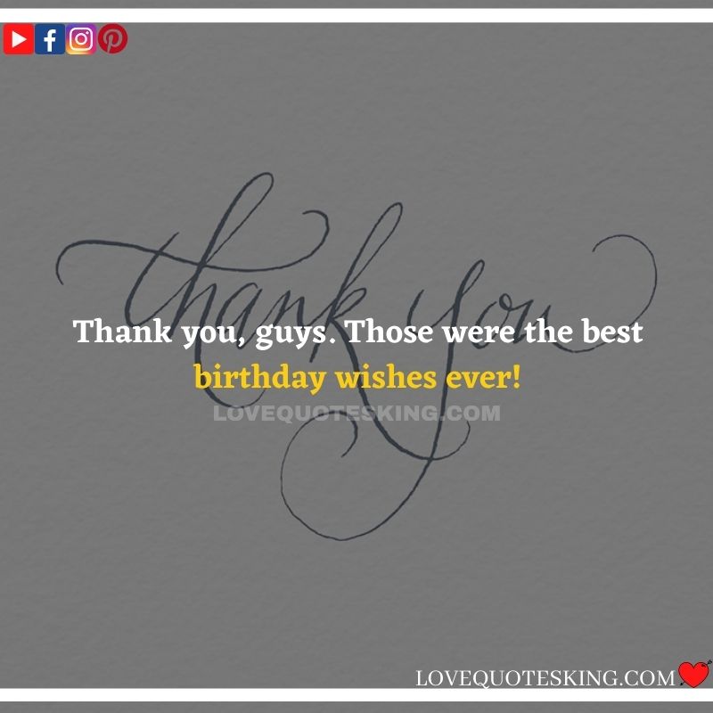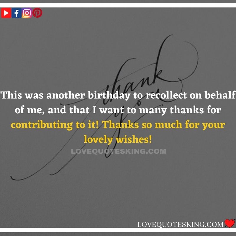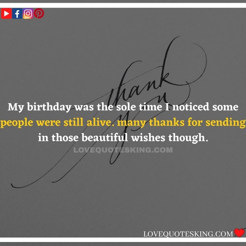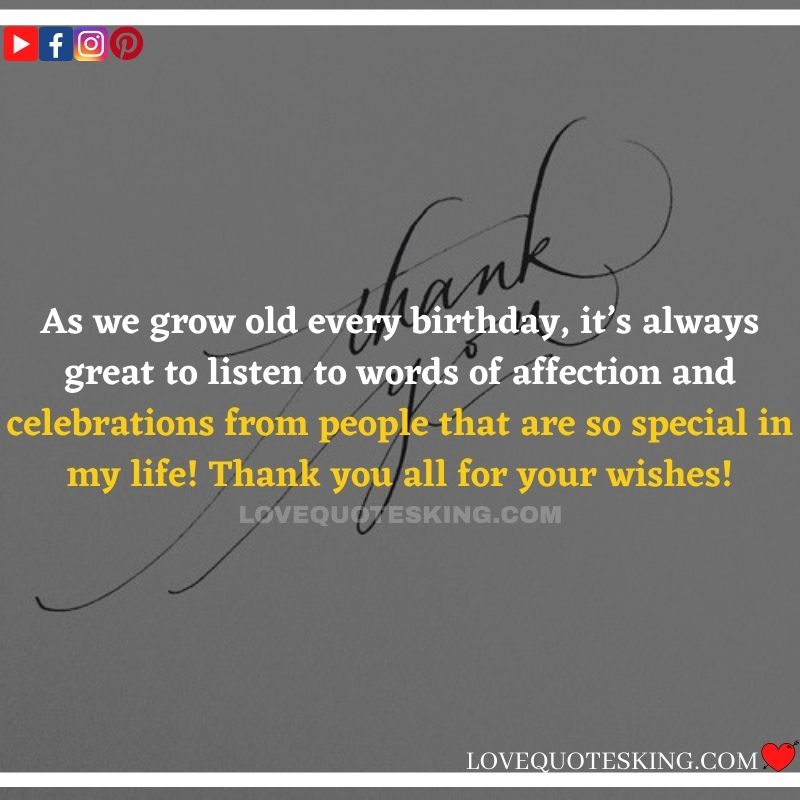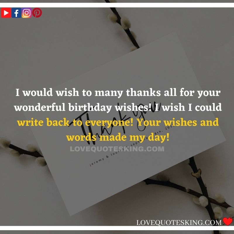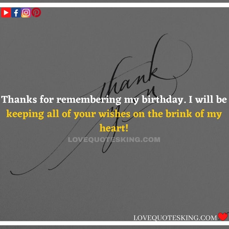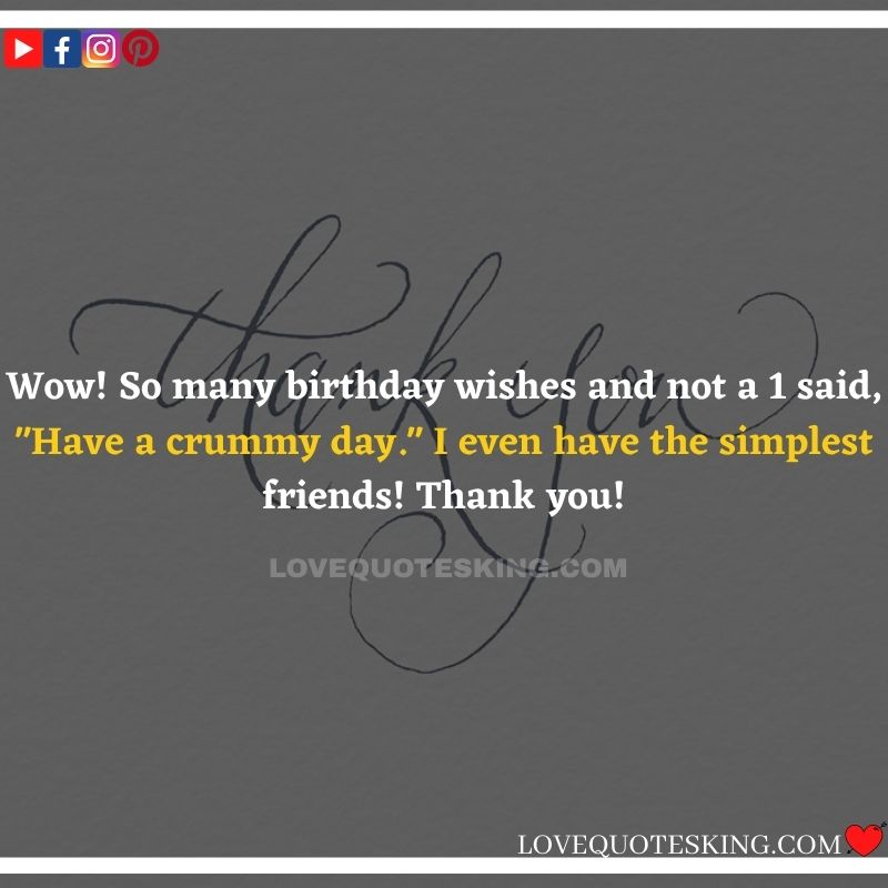 Best ②⓪⓪ Thank you quotes for birthday wishes When your birthday comes around, there’s almost nothing as fun as getting wishes, messages, and texts from friends everywhere on the planet. Thanks to Facebook, Twitter, and texting, we hear from almost everybody we all know and care about! It makes birthdays special and exciting Thank You Messages for Birthdays. We might hear from a long-lost friend!