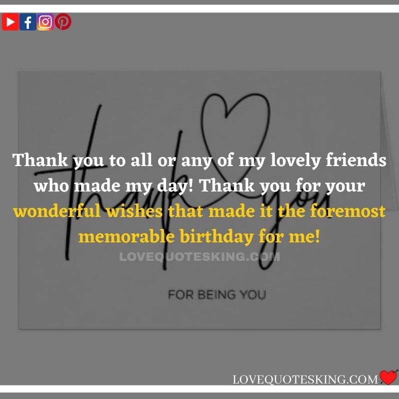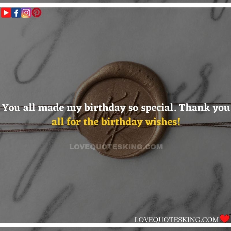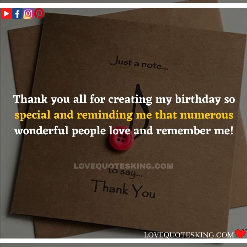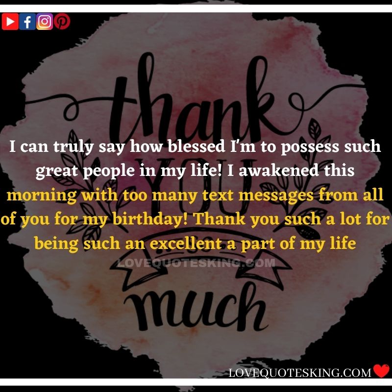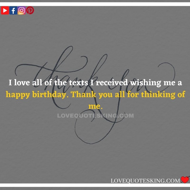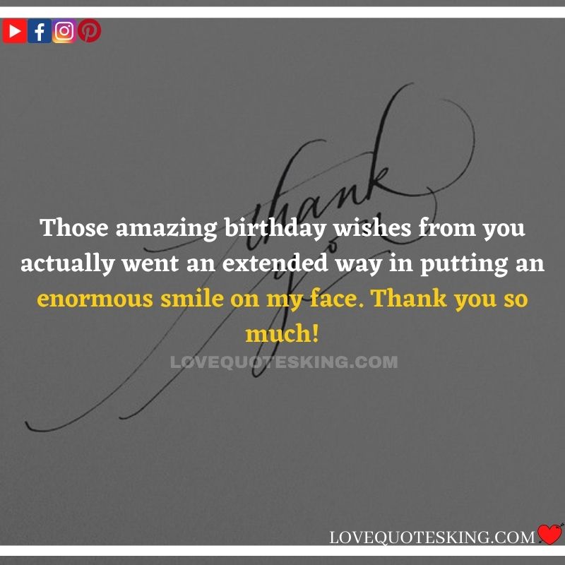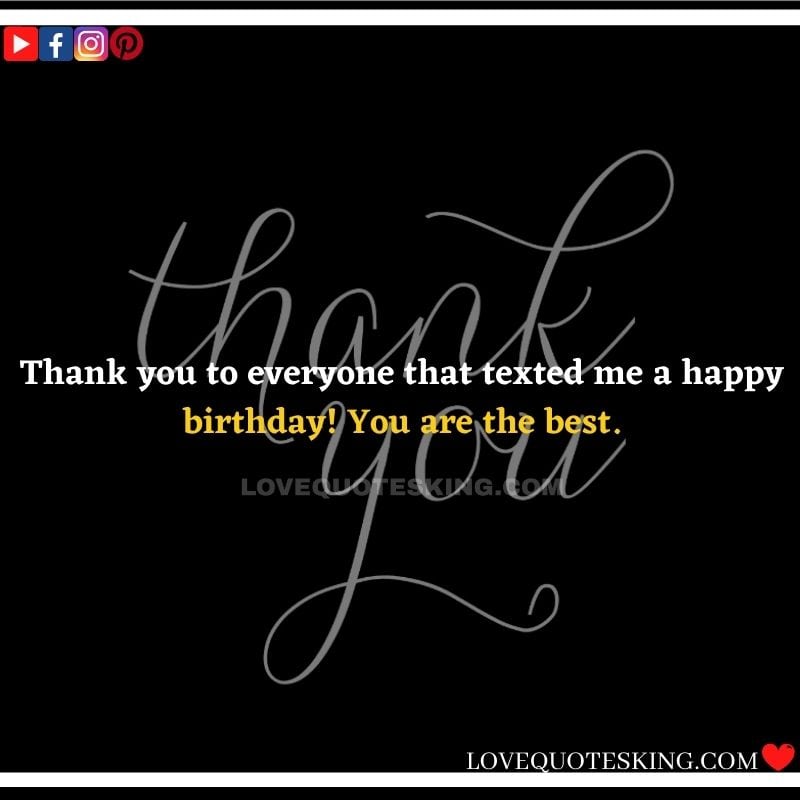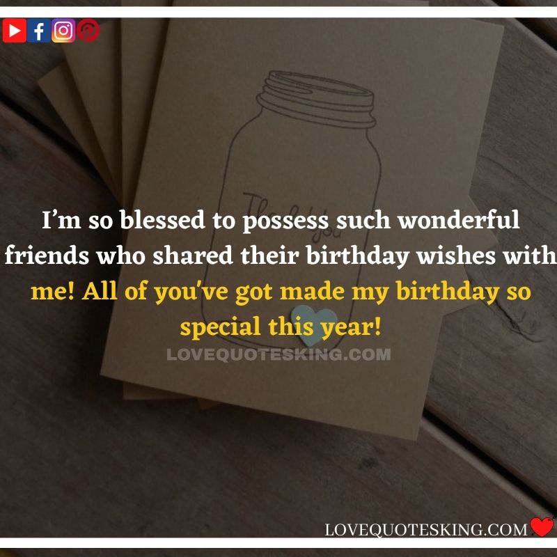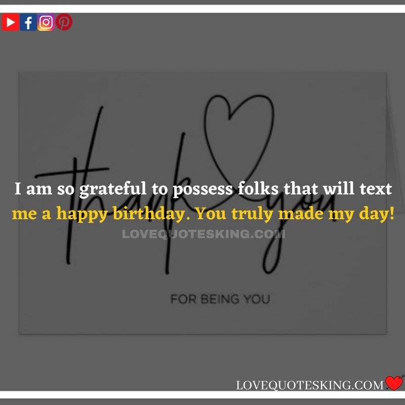 Best ②⓪⓪ Thank you quotes for birthday wishes When your birthday comes around, there’s almost nothing as fun as getting wishes, messages, and texts from friends everywhere on the planet. Thanks to Facebook, Twitter, and texting, we hear from almost everybody we all know and care about! It makes birthdays special and exciting Thank You Messages for Birthdays. We might hear from a long-lost friend!