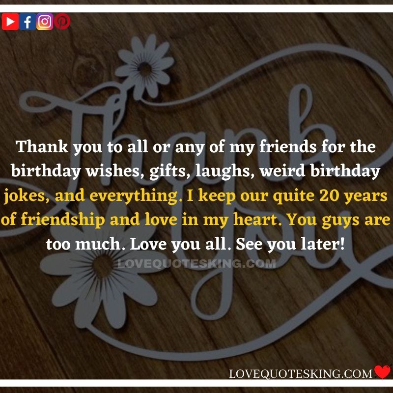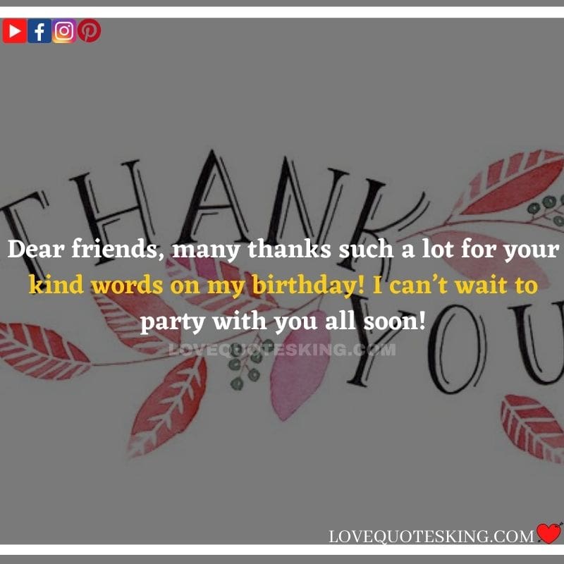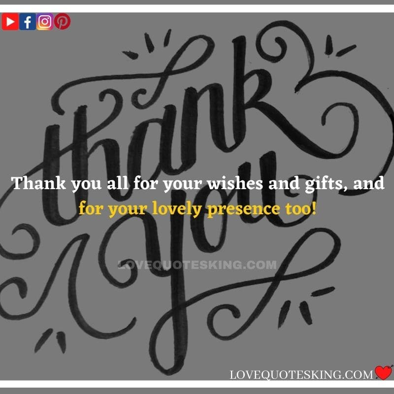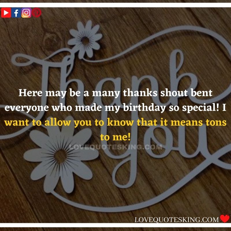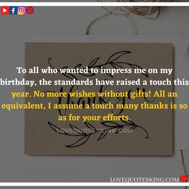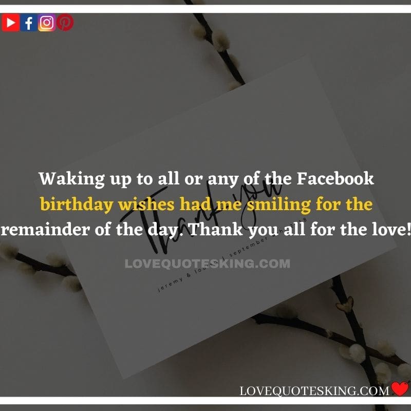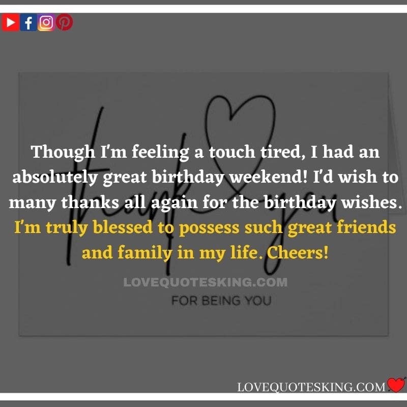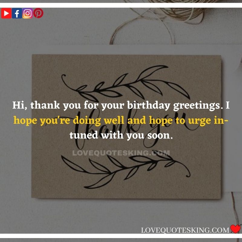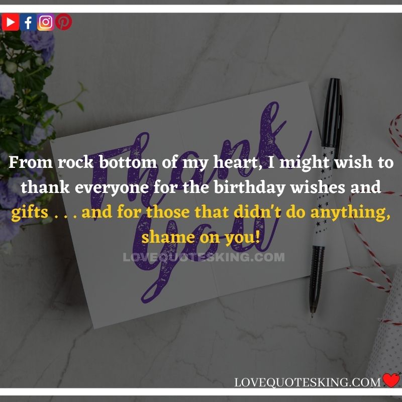 Best ②⓪⓪ Thank you quotes for birthday wishes When your birthday comes around, there’s almost nothing as fun as getting wishes, messages, and texts from friends everywhere on the planet. Thanks to Facebook, Twitter, and texting, we hear from almost everybody we all know and care about! It makes birthdays special and exciting Thank You Messages for Birthdays. We might hear from a long-lost friend!