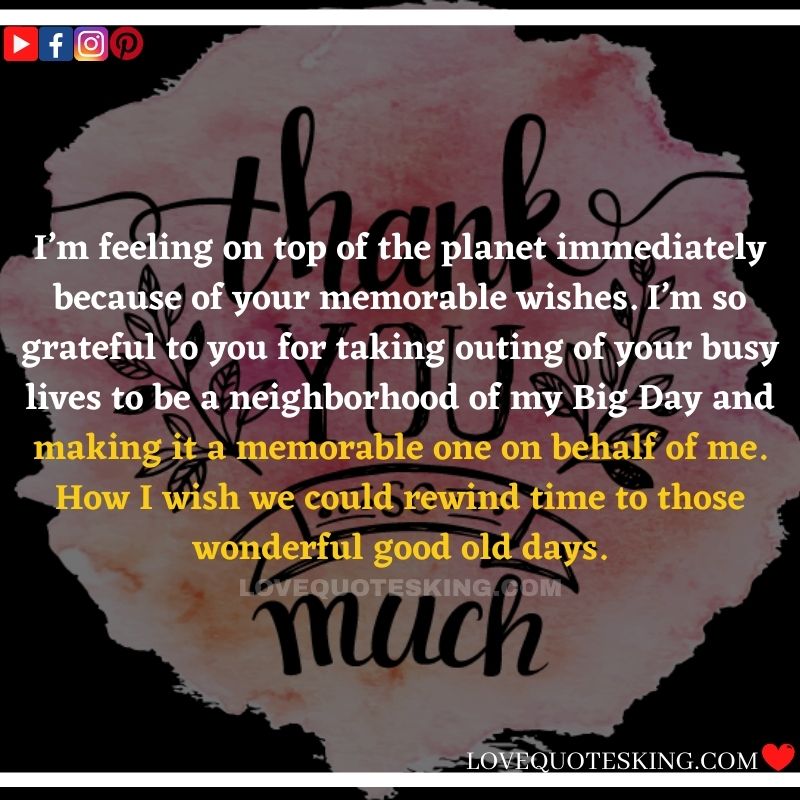 I’m feeling on top of the planet immediately because of your memorable wishes. I’m so grateful to you for taking outing of your busy lives to be a neighborhood of my Big Day and making it a memorable one on behalf of me. How I wish we could rewind time to those wonderful good old days.
