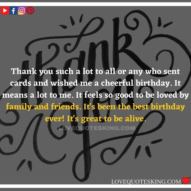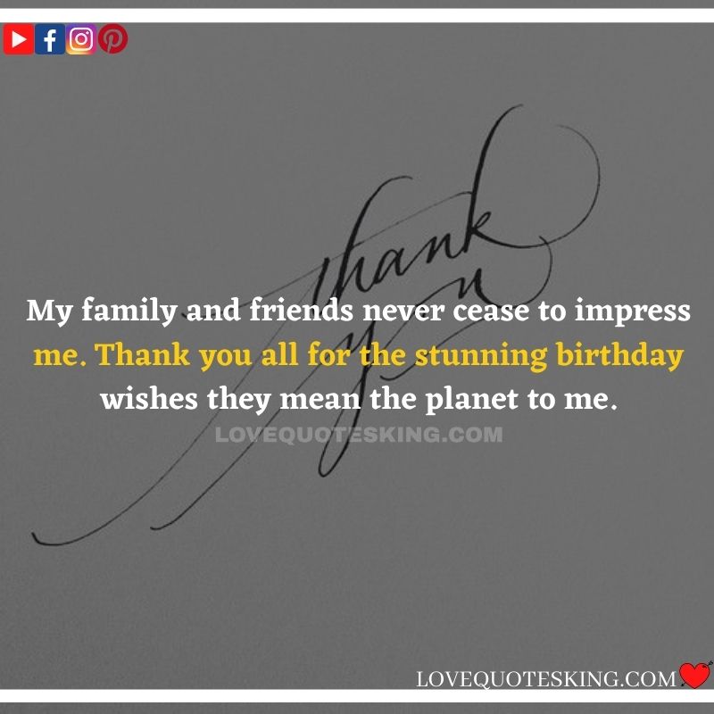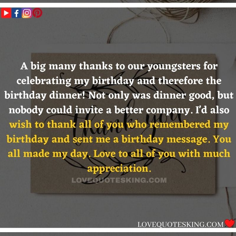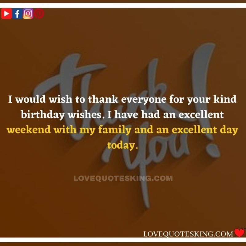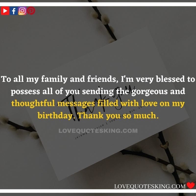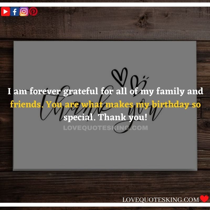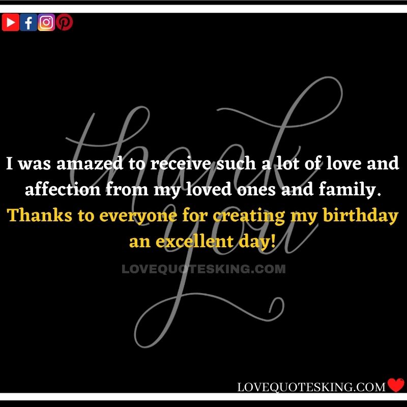 My lovely family always makes the foremost effort to share the absolute best birthday wishes, i would like to mention an enormous many thanks to you for the birthday wish you so kindly sent me. My day was an excellent one because of greatest family an individual could wish for. many thanks so much! Can’t wait to ascertain you all again soon!