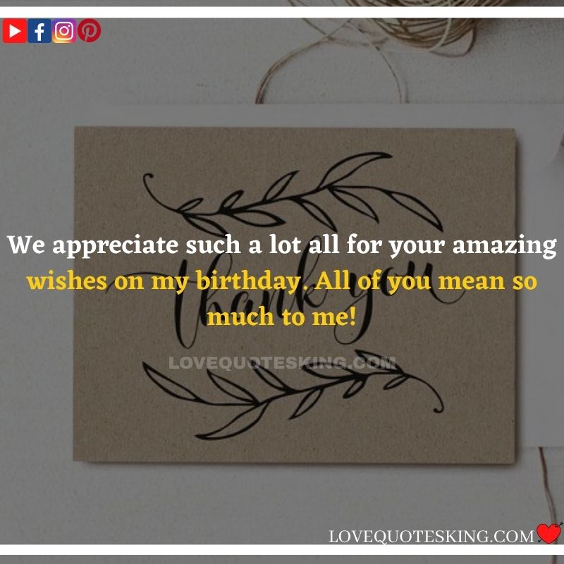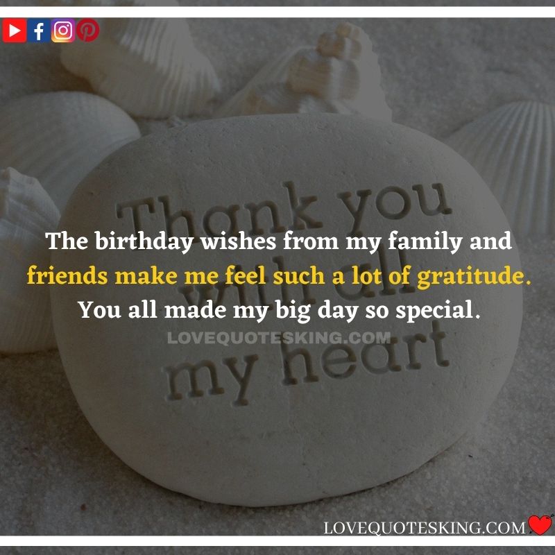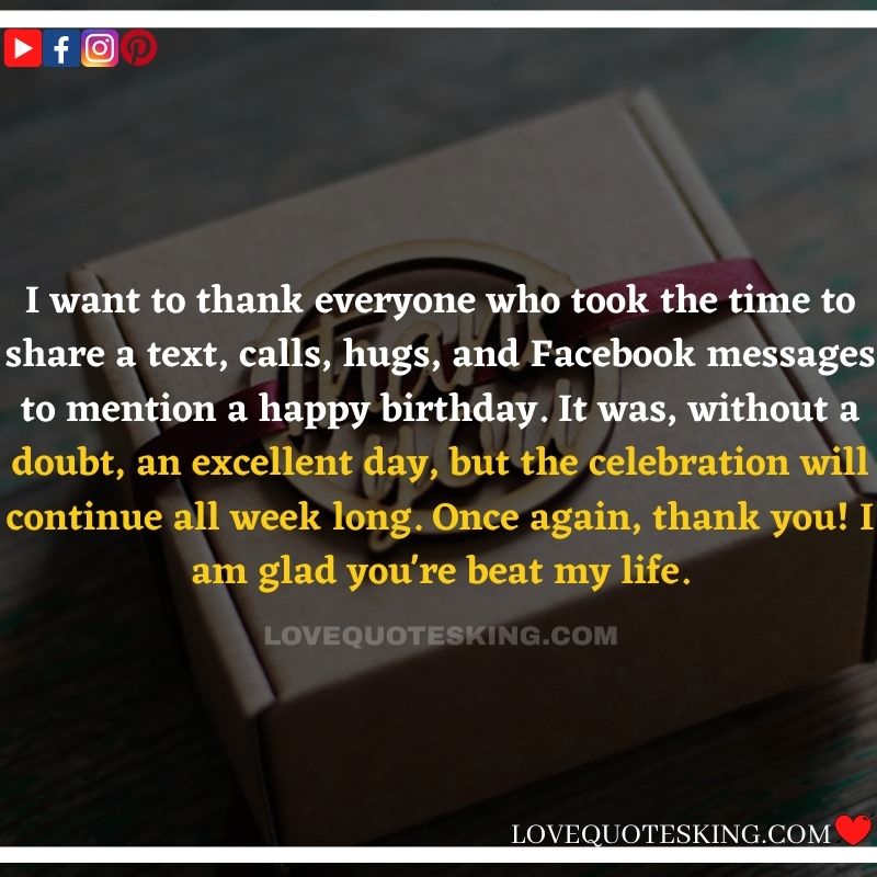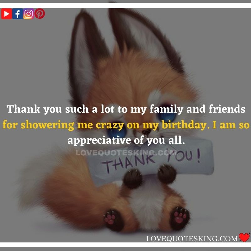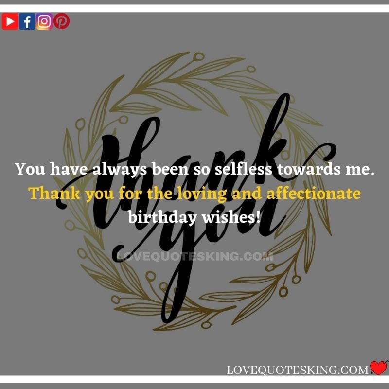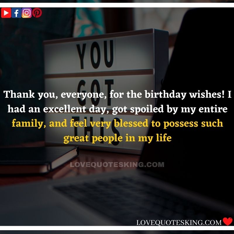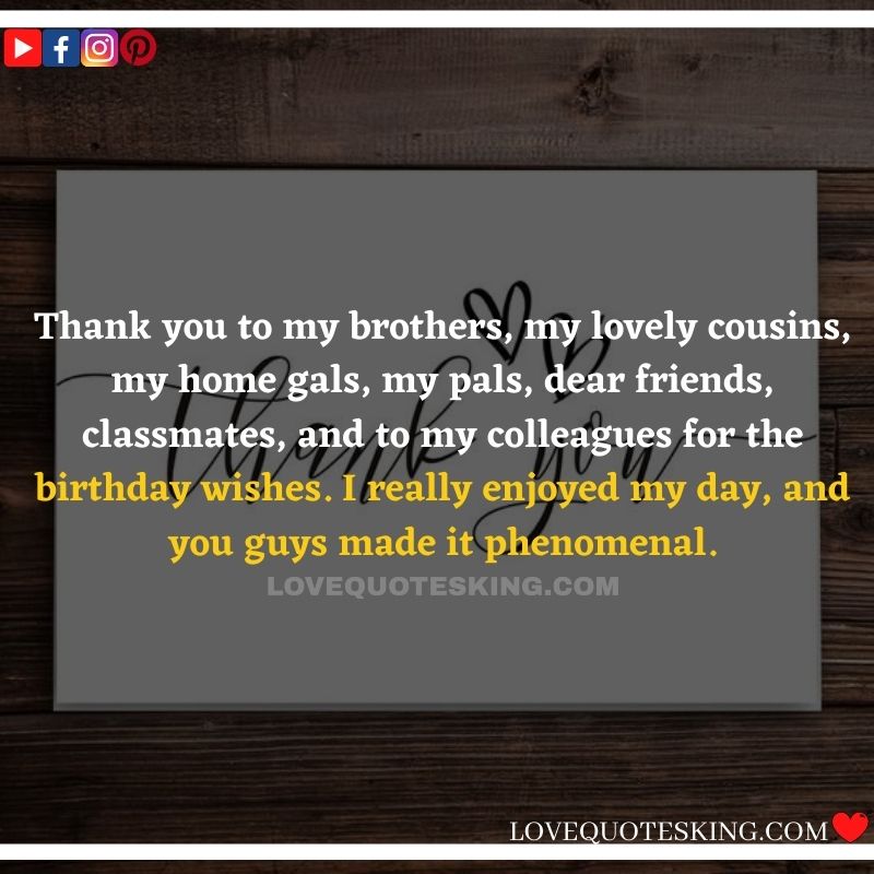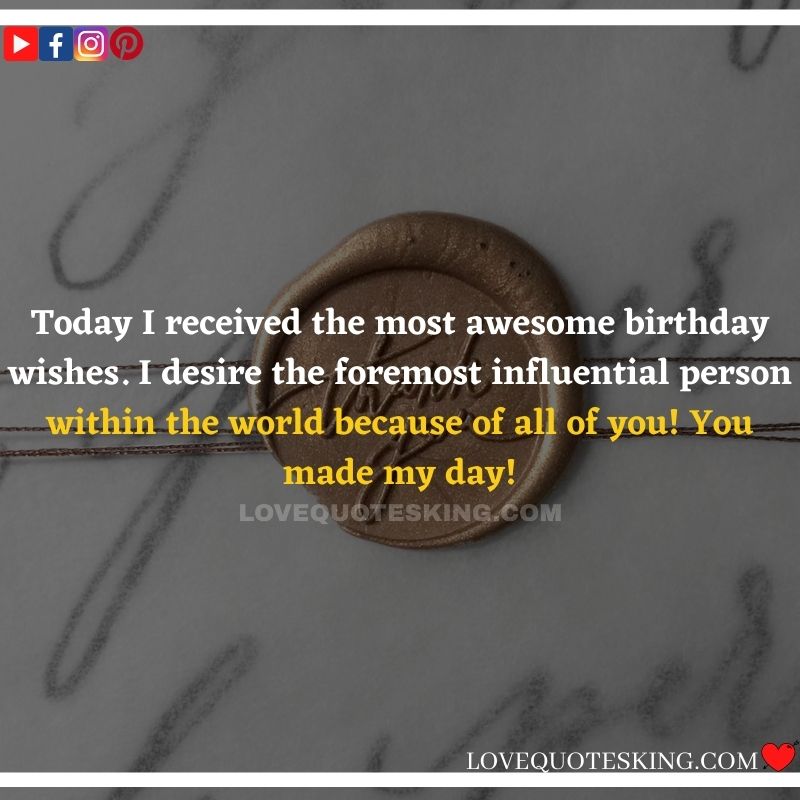 My lovely family always makes the foremost effort to share the absolute best birthday wishes, i would like to mention an enormous many thanks to you for the birthday wish you so kindly sent me. My day was an excellent one because of greatest family an individual could wish for. many thanks so much! Can’t wait to ascertain you all again soon!