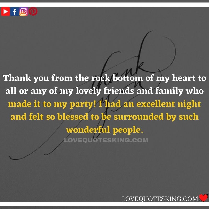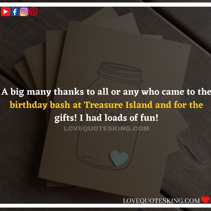 It’s amazing when friends and loved ones shower you with sweet wishes and messages on our birthday. Sometimes these messages can even mean more than the gifts you receive on that special day of yours.Thank you Notes for Birthday Wishes Apart from the good feeling that these birthday wishes bring, they also tell you how much your loved ones think about you and appreciate your friendship or presence in their lives. Birthday thanks message ! And when loved ones send you birthday wishes, it’s only fine that you simply reciprocate by thanking them for his or her wishes. But sometimes we come short of words to mention many thanks. If you regularly end up therein situation where you would like to mention many thanks to your family and friends for the birthday wishes they sent you but don’t know how to come up with very meaningful messages to express your gratitude, this page is here to help you.Thank you Notes for a Birthday Party.