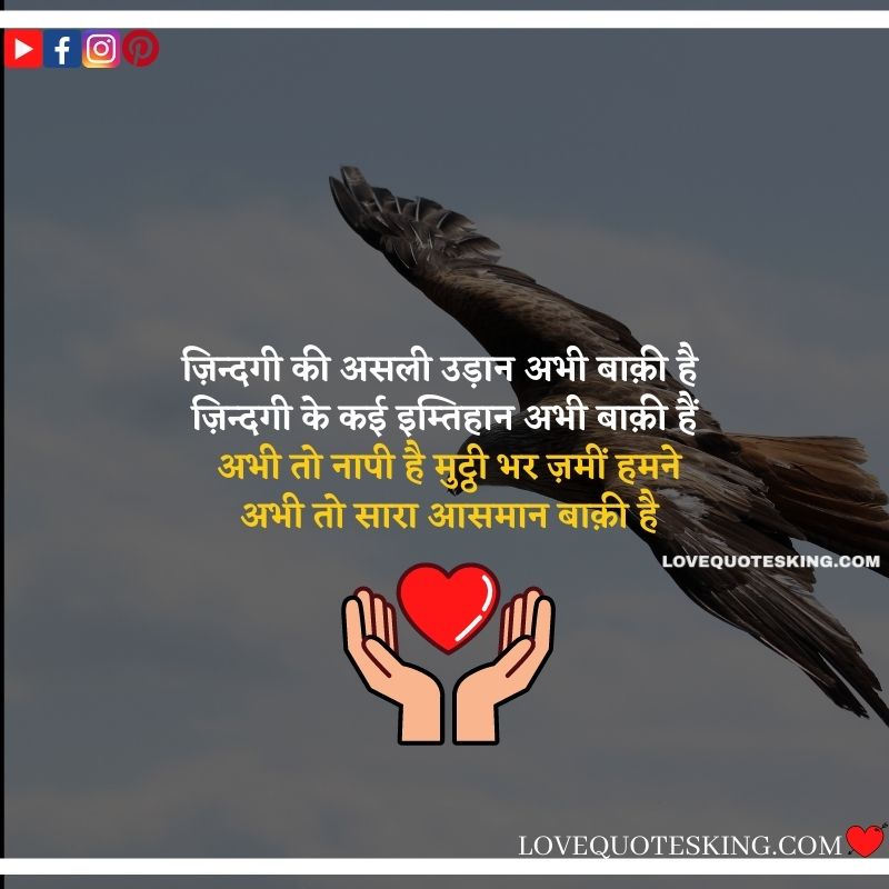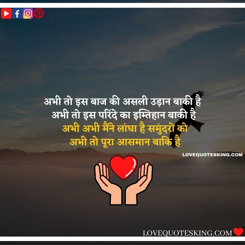 अभी तो इस बाज की असली उड़ान बाकी है अभी तो इस परिंदे का इम्तिहान बाकी है अभी अभी मैंने लांघा है समुंदरों को अभी तो पूरा आसमान बाकि है