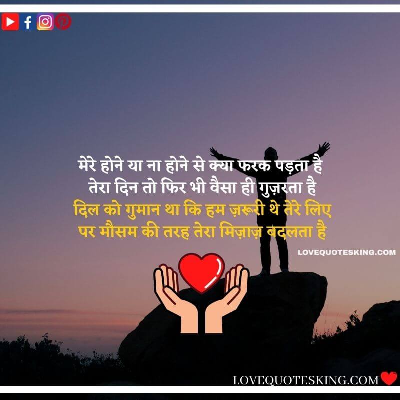 मेरे होने या ना होने से क्या फरक पड़ता है तेरा दिन तो फिर भी वैसा ही गुज़रता है दिल को गुमान था कि हम ज़रूरी थे तेरे लिए पर मौसम की तरह तेरा मिज़ाज़ बदलता है