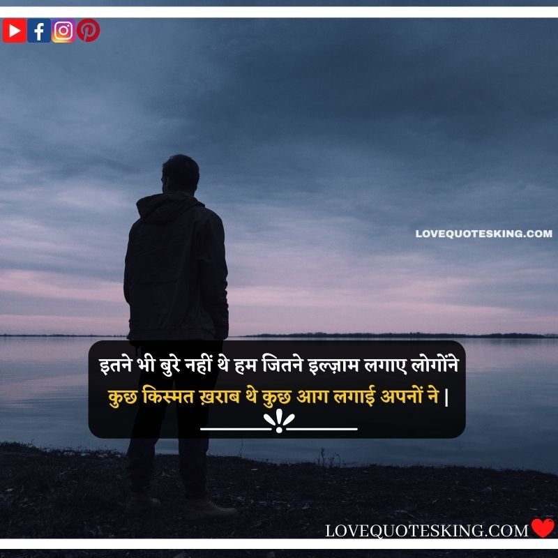 इतने भी बुरे नहीं थे हम जितने इल्ज़ाम लगाए लोगोंने , कुछ किस्मत ख़राब थे कुछ आग लगाई अपनों ने |