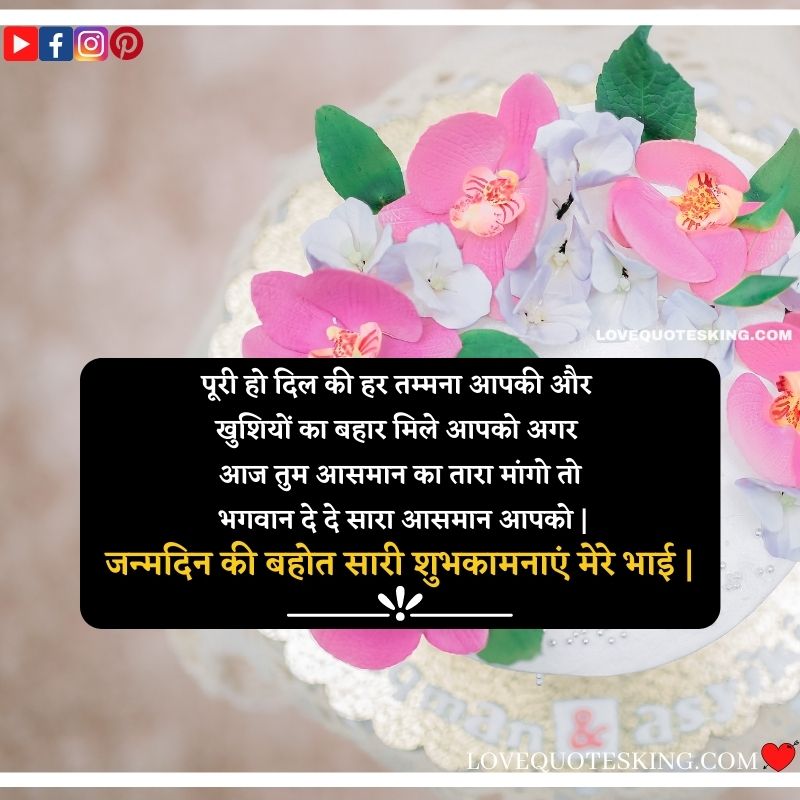 पूरी हो दिल की हर तम्मना आपकी और खुशियों का बहार मिले आपको अगर आज तुम आसमान का तारा मांगो तो भगवान दे दे सारा आसमान आपको |जन्मदिन की बहोत सारी शुभकामनाएं मेरे भाई |