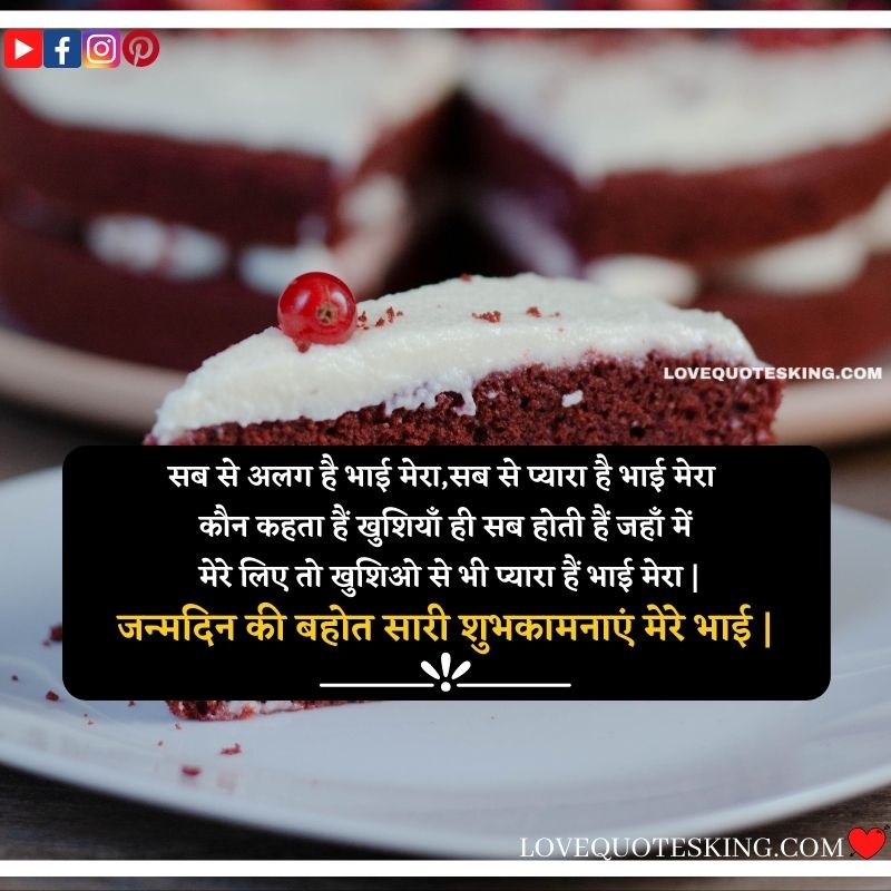 सब से अलग है भाई मेरा,सब से प्यारा है भाई मेरा ,कौन कहता हैं खुशियाँ ही सब होती हैं जहाँ में, मेरे लिए तो खुशिओ से भी प्यारा हैं भाई मेरा | जन्मदिन की बहोत सारी शुभकामनाएं मेरे भाई |