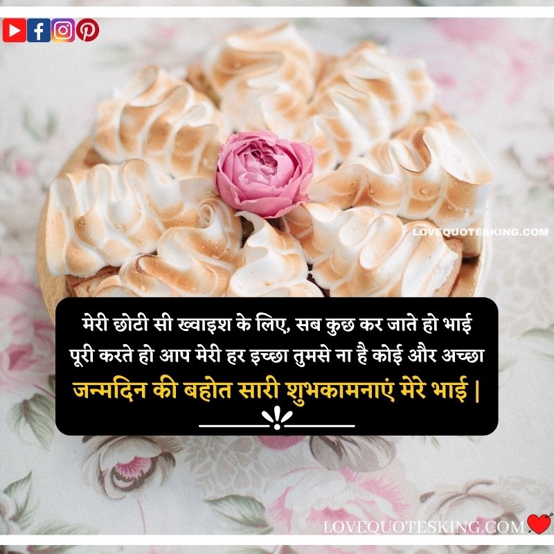 मेरी छोटी सी ख्वाइश के लिए, सब कुछ कर जाते हो भाई, पूरी करते हो आप मेरी हर इच्छा, तुमसे ना है कोई और अच्छा | जन्मदिन की बहोत सारी शुभकामनाएं मेरे भाई |