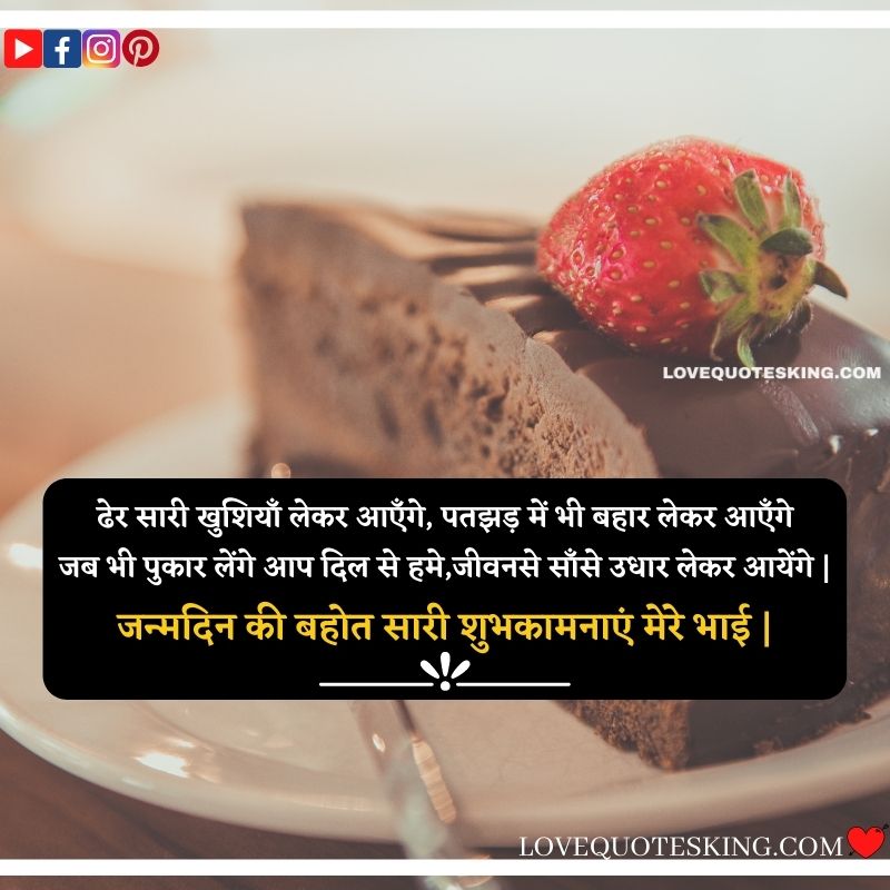 ये सभी brother bday wishes in hindi इन हिन्दी हम आपके लिए ख़ास चुनकर लाये हैं| आशा करते हैं कि आपको यहाँ पर दिए गए सभी funny bday wishes for brother in hindi जरूर पसंद आये होंगे |और इसको सोशल मीडिया पर Bhai Ka Birthday Status Share करना ना भूलियेगा और हमे फॉलो ही जरूर कीजियेगा | हम वहापर डेली नई कोट्स अपलोड करते है | धन्यवाद् |
