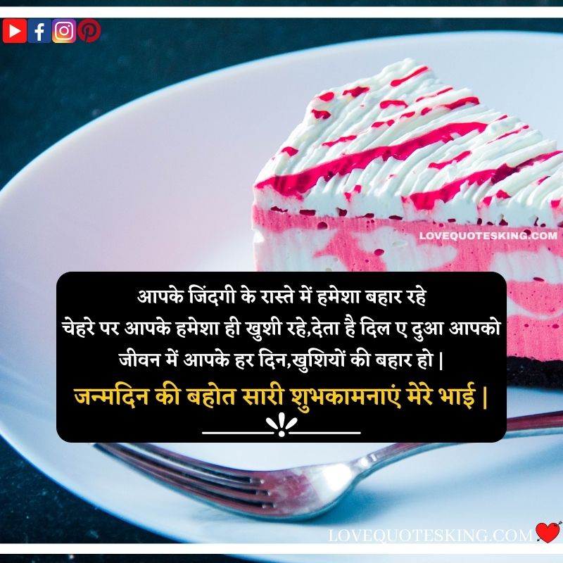 आपके जिंदगी के रास्ते में हमेशा बहार रहे,चेहरे पर आपके हमेशा ही खुशी रहे,देता है दिल ए दुआ आपको ,जीवन में आपके हर दिन,खुशियों की बहार हो | जन्मदिन की बहोत सारी शुभकामनाएं मेरे भाई |