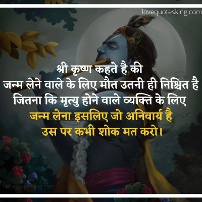 श्री कृष्ण कहते है की जन्म लेने वाले के लिए मौत उतनी ही निश्चित है, जितना कि मृत्यु होने वाले व्यक्ति के लिए जन्म लेना, इसलिए जो अनिवार्य है उस पर कभी शोक मत करो।